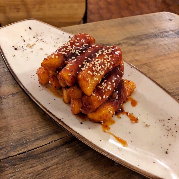 La noche que fuimos éramos tres, dos amantes del picante y una principiante en la gastronomía coreana, así que decidimos pedir un poco variado. Un clásico como el dolsot bibimbap no podía faltar, arroz en cuenco de hierro con topping de huevo crudo, verduras varias y ternera picada. Nos sirvieron la salsa de chilli rojo aparte pero recomiendo encarecidamente que le eches un poco. Otro clásico como el teokk-kkochi también tenía que estar presente en la mesa: pasta de arroz salteada con chilli rojo, miel y sésamo.