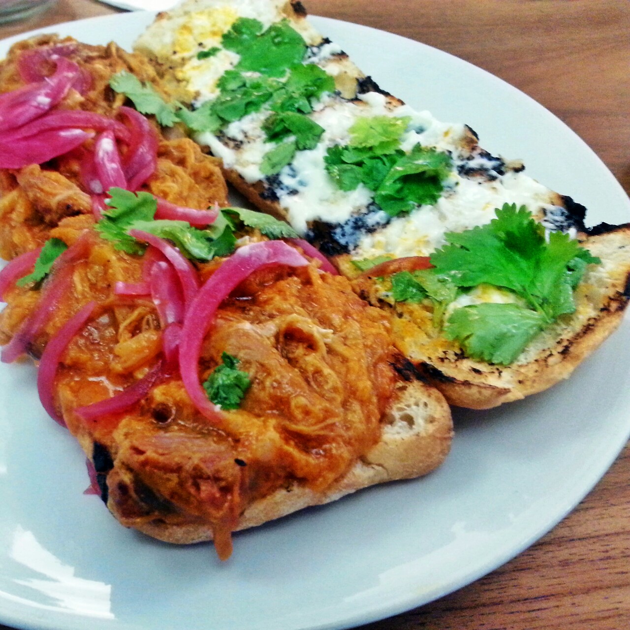Tacos de pulled pork con guacamole, nata agria y chips de yuca