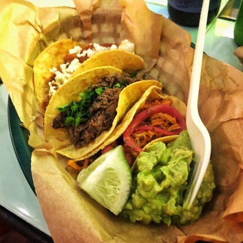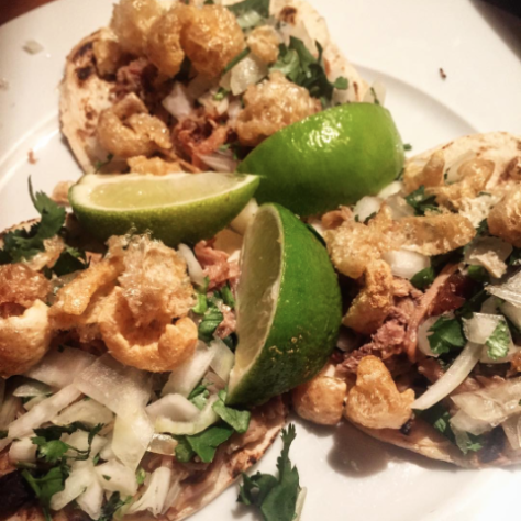 Tacos de pulled pork con guacamole, nata agria y chips de yuca